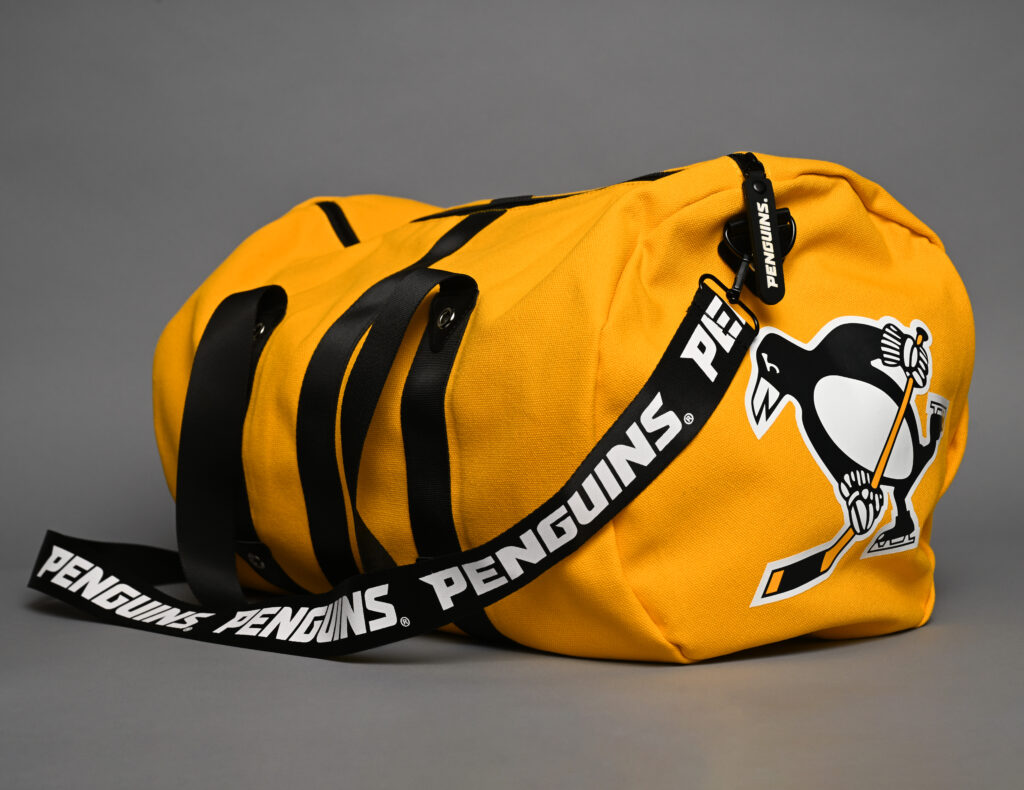 Our Penguins Retro Canvas Duffle Bag draws inspiration from the bold new 2025.26 Third Jersey – the ‘Penguins Gold’ is reminiscent of Mario Lemieux and the Penguins of the 1980s. The Penguins wordmark is displayed on the carrying strap while the zipper pulls are color coordinated by bag level. This duffle measures 18” x 12” x 12”. Designed for both function and fandom, it’s a standout piece for travel, training, or game day. Pack your gear and Let’s Go Pens!