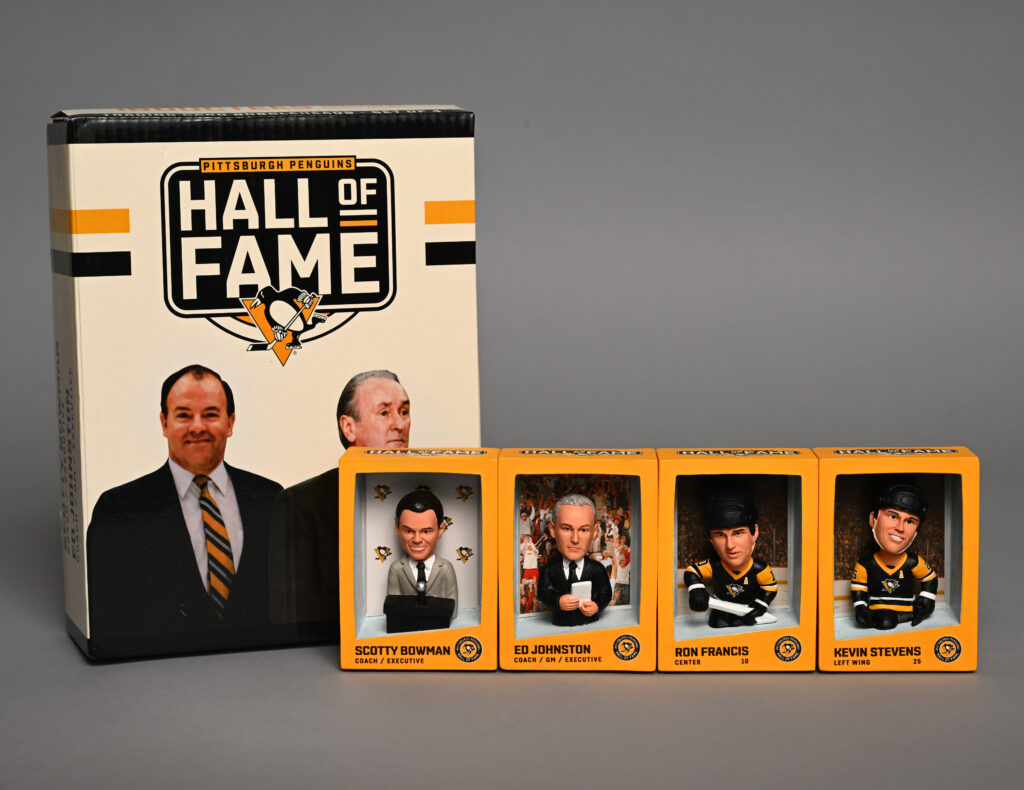 Our Penguins 2025 Hall of Fame Inductees Mini Trading Card Bobblehead Set celebrates the Penguins Hall of Fame Class of 2025, featuring Scotty Bowman, Ron Francis, Ed Johnston, and Kevin Stevens. Each figure measures 3.5” tall and includes a trading card-inspired design highlighting the inductee’s legacy. Together, they form a unique tribute to the individuals who have helped transform the club into one of the National Hockey League’s elite franchises. Set includes four (4) mini trading card bobbleheads.