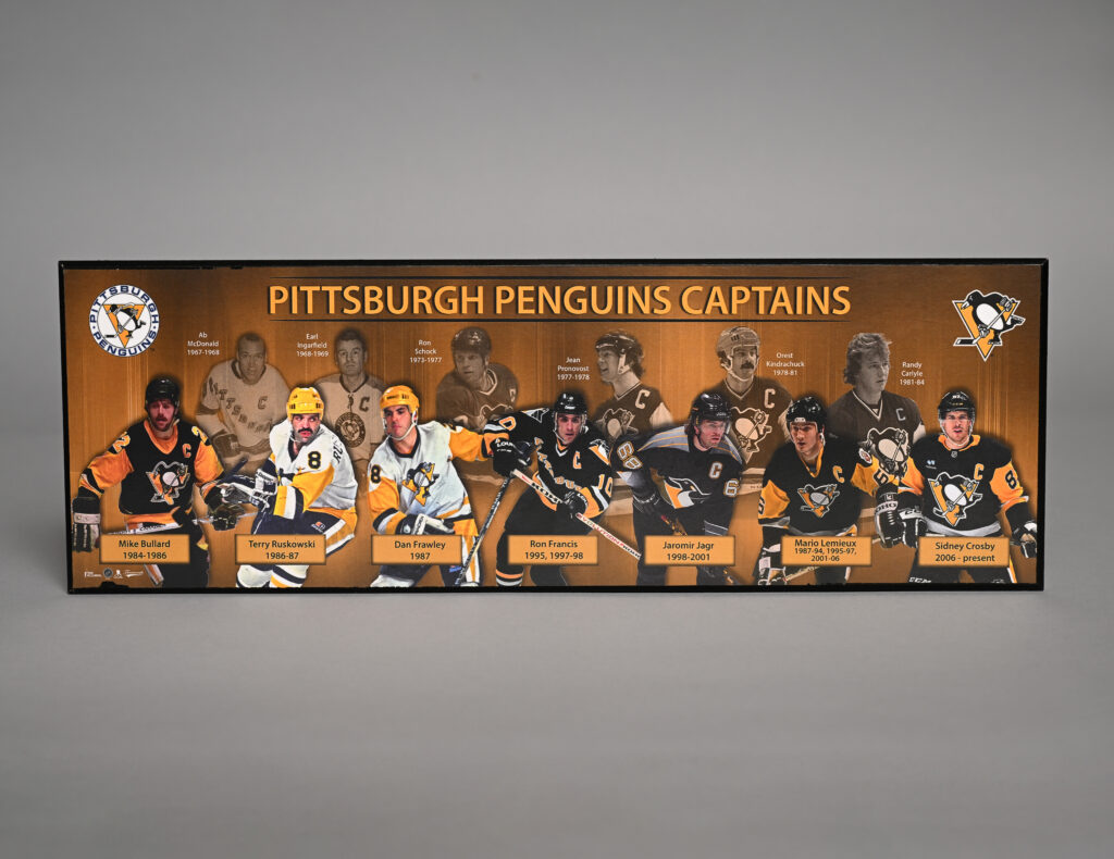 Our Penguins Captains Collage commemorates every captain in Pittsburgh Penguins history, honoring the leaders who have worn the “C” and shaped the franchise on and off the ice. It highlights each captain’s name and era, creating a powerful timeline of leadership. This 5” x 15” piece is a meaningful tribute to the legacy, pride, and tradition of the club.