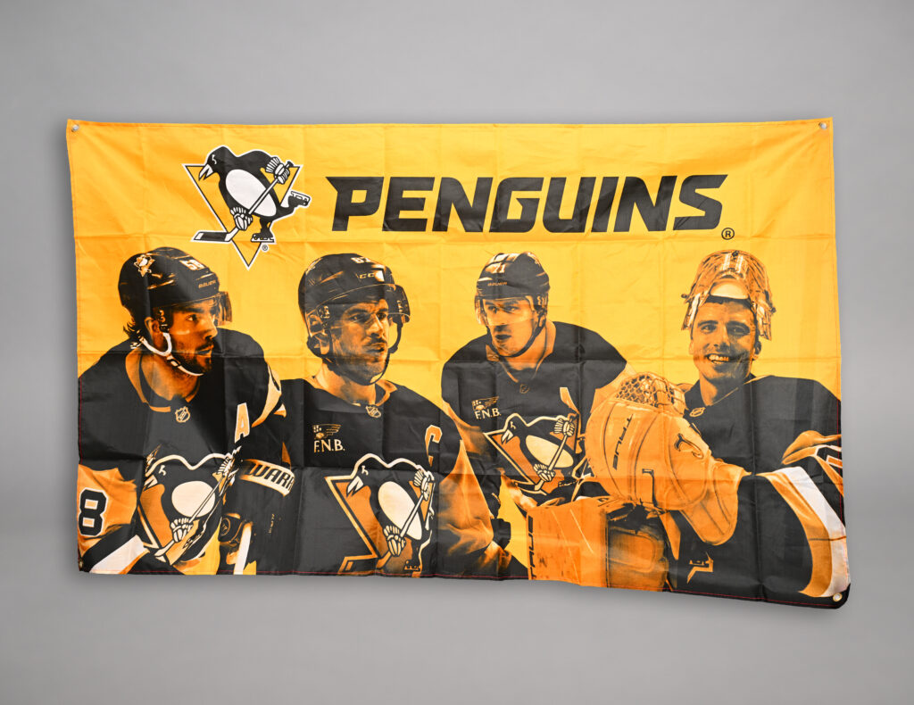 Our Penguins Legends Wall Flag showcases the Penguins logos alongside four of hockey’s most legendary players: Sidney Crosby, Evgeni Malkin, Kris Letang, and Marc-André Fleury. Crafted for display and measuring 3’ x 5’, it includes four (4) grommets for easy hanging, making it perfect for a wall, fan cave, or game day setup all while honoring the legends who have defined the modern era of Penguins hockey.