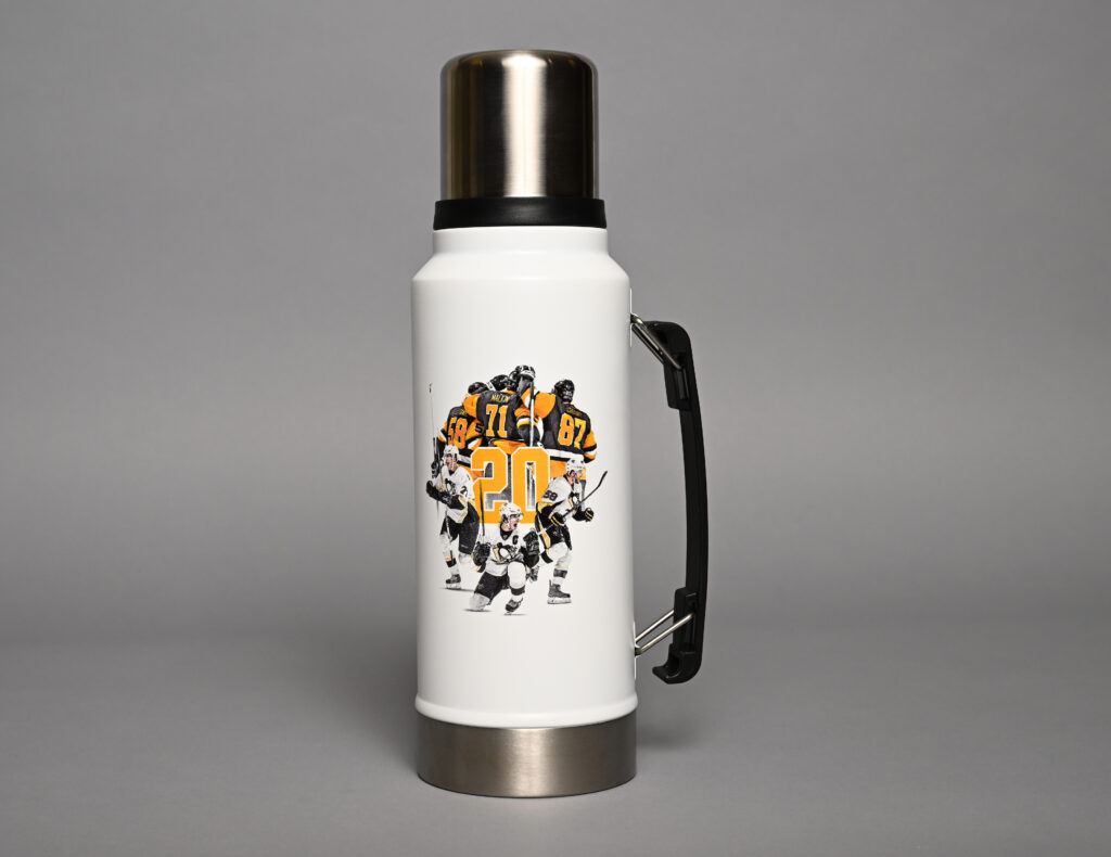 Our Penguins Big Three Thermos celebrates 20 seasons of teamwork, featuring the wordmark logo and a unique graphic of Sidney Crosby, Evgeni Malkin, and Kris Letang, showcasing both their early years as young players and now as veterans. Built for durability and performance, this 34 oz. thermos is stainless steel, BPA-free, and features double-wall vacuum insulation – keeping beverages hot or cold while honoring the trio’s remarkable legacy on the ice.