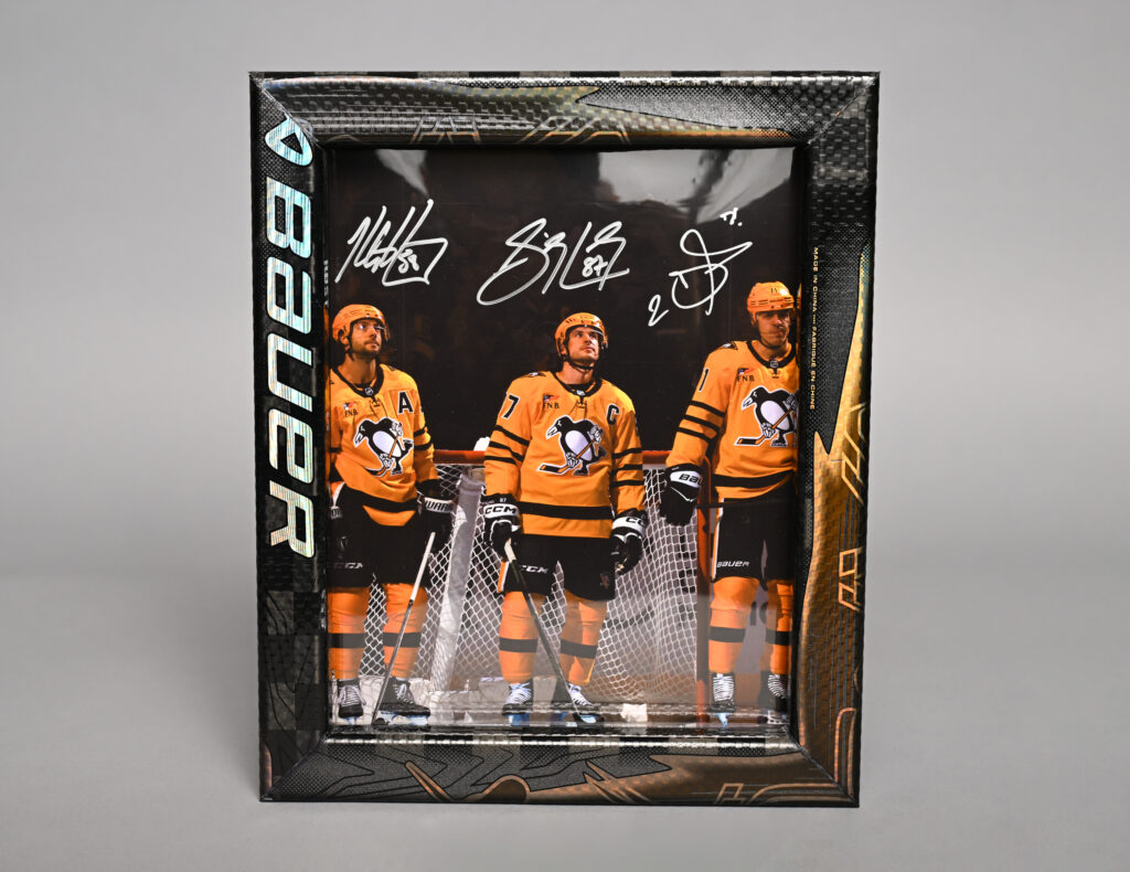 - Platinum^^ ($5,066) = Big Three Autographed 8” x 10” Photo in Custom Frame from Penguins Player-Used Sticks
